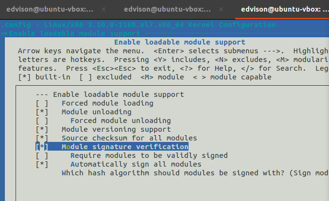 现在加载到目标内核中不会报错“Invalid module format”了,但是3.7后的内核可能会加入模块签名校验机制,在编译内核时可以选择是否开启: