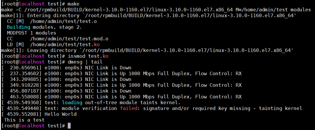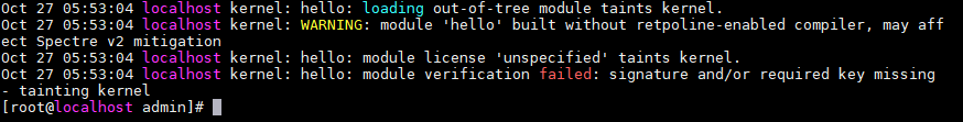 make -C $(KERNEL_PATH) M=$(shell pwd) clean可直接insmod模块,虽然会报错没过签名验证,但能正常执行:
